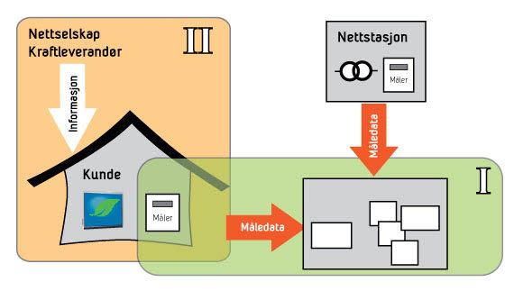Fokus i prosjektet var informasjonsutveksling internt hos nettselskap og mellom nettselskap og husholdningskunder (Del 1). Data fra målere i nettstasjoner ble også benyttet. Prosjektet arbeidet for å realisere miljøgevinst gjennom økt energieffektivitet og økt bevissthet blant husholdningskunder (Del 2). Dette er illustrert i figuren nedenfor.