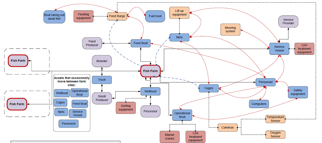 - Develop a conceptual network model of the salmon aquaculture industry that comprises all infrastructure ranging from fixed farm installations to any movable equipment items that come into contact with farm water (Fig. 1 shows a draft version);