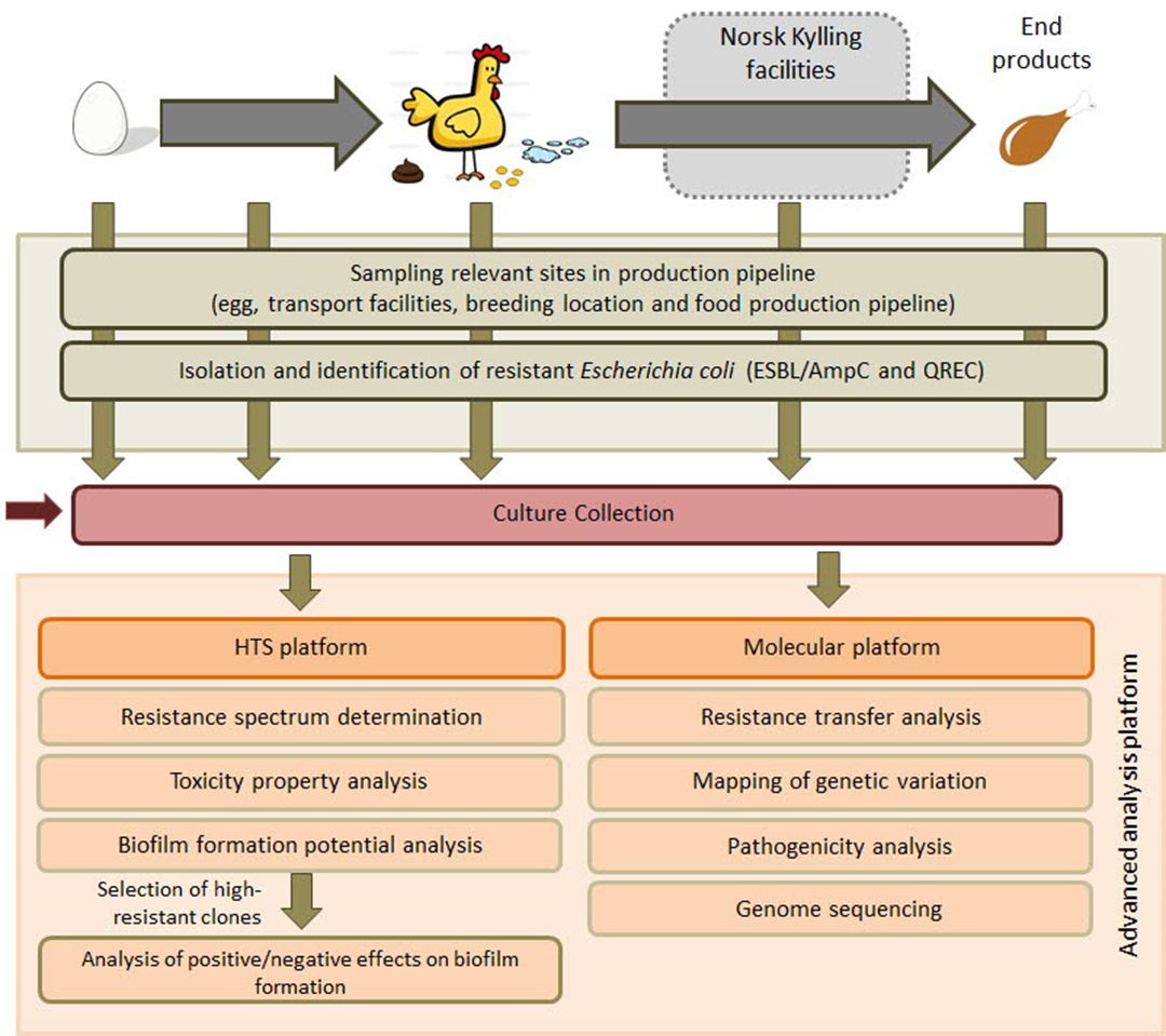 I ResMap vil vi utføre en omfattende studie for å kartlegge forekomsten av resistens i en representativ bedrift (Norsk Kylling AS). En stor skala karakterisering av resistente stammer vil øke kunnskapen om viktige faktorer i resistens utvikling som for eksempel evne til biofilm dannelse, variasjon i resistens spekter (multiresistens), resistens mekanismer, overføring av resistens til humane patogene og til fjørfe patogene. Vi vil også studere effekten av vanlig brukte disinfeksjonsmidler på biofilmdannelse i modellsystemer.