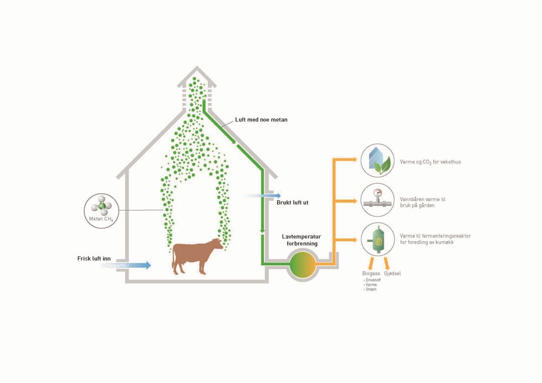 Fordøyelsessystemet og foret til kyr gjør at de slipper de ut store mengder metan (CH4). Metan er en svært potent drivhusgass – mange ganger sterkere enn CO2. Et av problemene er at metan fra kuene slippes rett ut i luften og konsentrasjonen av metan blir såpass lav at metanet blir vanskelig å fange.