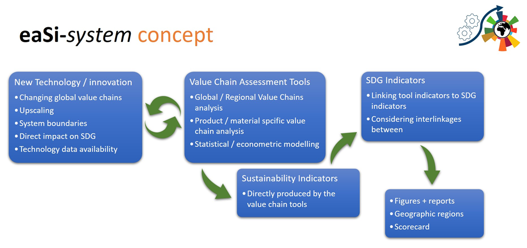 eaSi-system-analysen starter med den nye teknologien (eller prosessen). Først kartlegges relevante aspekter som systemgrenser, teknologidata, oppskalering av nye teknologier og, direkte effekter på bærekraftsmål. Så analyseres teknologiens påvirkning på globale verdikjeder og de videre konsekvensene av teknologien. Deretter linkes disse resultatene til FNs bærekraftsindikatorer. Hvordan de ulike bærekraftsindikatorene påvirker hverandre tas også i betraktning. Til slutt utvikles standardiserte rapporter og figurer, der resultater kan brytes ned på geografiske regioner, og ulike tidsskalaer, og benyttes i målstyring og beslutningsstøtte.