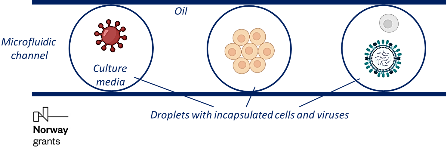 For å adressere de ambisiøse eksperimentelle målene til prosjektet skal det utvikles en dråpebasert mikrofluidikkplattform for langtidskultivering av adherente lungeepitelceller. Denne biokompatible plattformen vil tillate presis kontroll over levering av viruspartikler, NK-celler og signalmolekyler til de utsådde epitelcellene. Videre vil plattformen tillate direkte monitorering av interaksjonen mellom NK-celler og ulike populasjoner av epitelcellene gjennom infeksjonsløpet på enkeltcellenivå. Fabrikasjon av en slik plattform møter flere teknologiske utfordringer (f.eks. presis lokal kontroll over overflatefukting) og løsningen av disse vil resultere i en universell plattform for både langtids-cellekultiveringsforsøk og effektiv kontroll over operasjoner med dråper på mikronivå.