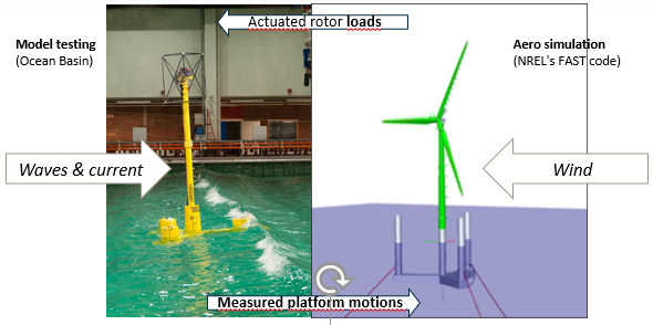 Bakgrunn: Det er utfordrende å teste flytende vindturbiner i hydrodynamiske laboratorier på grunn av 1) dårlig vindfeltmodellering og 2) konflikter i Froude-Reynolds-skalering samt at det er umulig å bruke korrekte rotorbelastninger med en fysisk rotor.