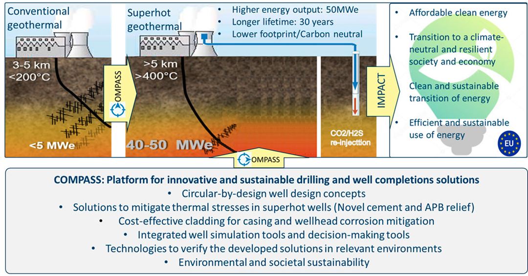 Med et totalbudsjett på 5 millioner euro, er COMPASS-prosjektet et samarbeid for å utvikle kostnadseffektive og innovative bore- og fullføringsteknologier som vil utnytte potensialet til supervarm geotermisk energi. Ved å forbedre brønnintegritet, redusere borekostnader og minimere miljøpåvirkningen, har prosjektet som mål å gjøre geotermisk energi til en mer pålitelig og bærekraftig løsning, og bidra til den globale overgangen til renere energi.