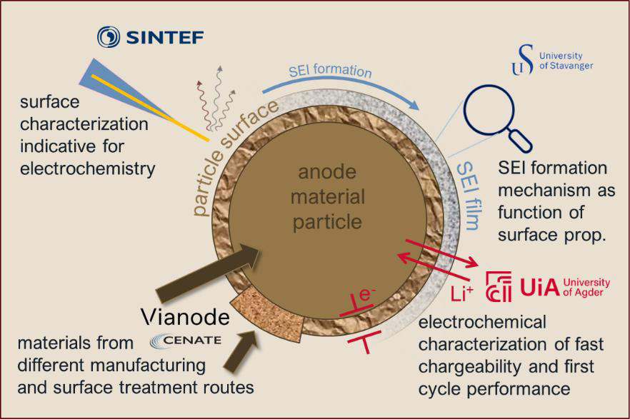 I prosjektet LINK - Linking Electrochemical and Chemo-Physical Properties of Anode Materials for the use in Lithium-Ion Batteries - gjør vi fundamentale studier av SEI-formasjon på både grafitt- og silisiumanoder, fra rene modellsystemer til fullcellebatterier. Elektrokjemisk karakterisering og strukturell og kjemisk analyse på nanoskala vil avdekke degraderingsmekanismene som begrenser ladehastigheten og antallet ladesykluser et batteri kan tåle i løpet av levetiden.