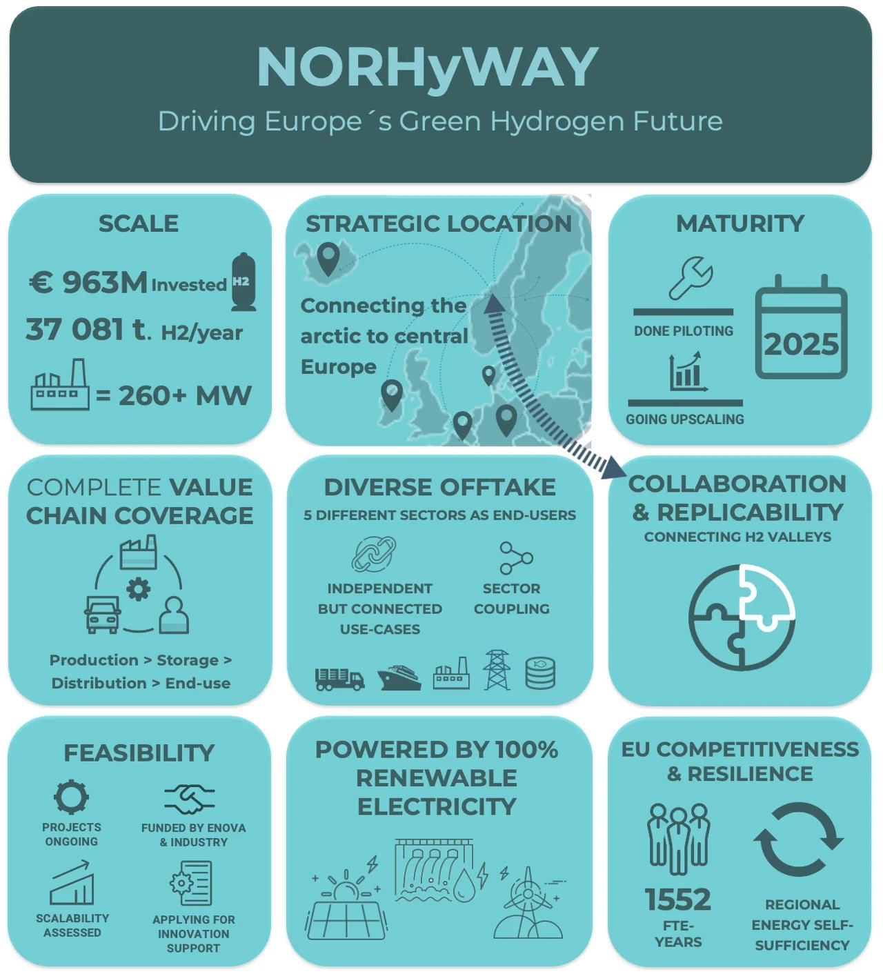 Med utgangspunkt i piloter og demonstrasjonsprosjekter, skal NORHyWAY sikre en fullskala utrulling av hydrogen. Prosjektet har som mål å oppnå en årlig produksjonskapasitet på omtrent 37.000 tonn grønt hydrogen innen 2030.