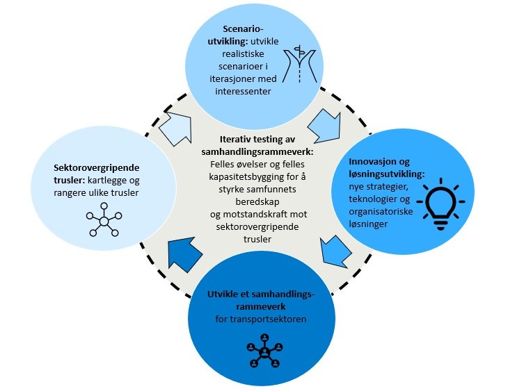 SAMTRANS vil utvikle og implementere et operativt samhandlingsrammeverk som styrker transportsektorens evne til å håndtere komplekse kriser. Rammeverket vil legge til rette for bedre samhandling, felles situasjonsforståelse og mer robust beslutningstaking på tvers av transportformer, sektorer og forvaltningsnivåer.