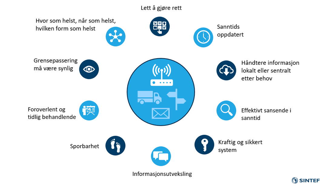 Disse elementene er av Tolletaten og eksperter i SINTEF identifisert som viktige i utvikling av fremtidens digitale grensestasjon. De er ment som inspirasjon og veiledning for idégenerering, ikke som en uttømmende beskrivelse av hva en slik løsning kan være. Dette er en visjon for løsningen, en beskrivelse av løsningen i overmorgen, ikke dagens og morgendagens løsninger. Det er derfor ikke forventet at mulige teknologiløsninger lar seg implementere umiddelbart. Vi trenger heller ikke løsninger på alt, men idéer som bringer oss fremover på ett eller flere av disse områdene.