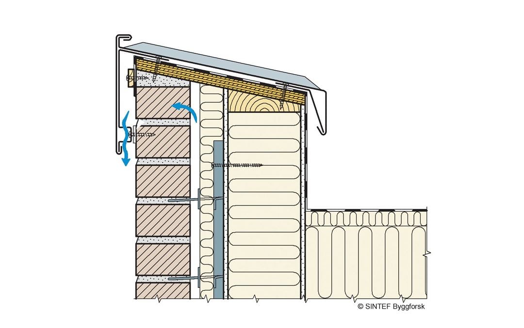 Når fasadene har luftet kledning, må parapetbeslaget være utformet for å tilfredsstille to, litt motstridende funksjonskrav: skjerming mot inndrev av nedbør (være så tett som mulig), og i tillegg gi mulighet for utlufting av veggkledningen (være åpen). Figur 2 viser et eksempel på dette.