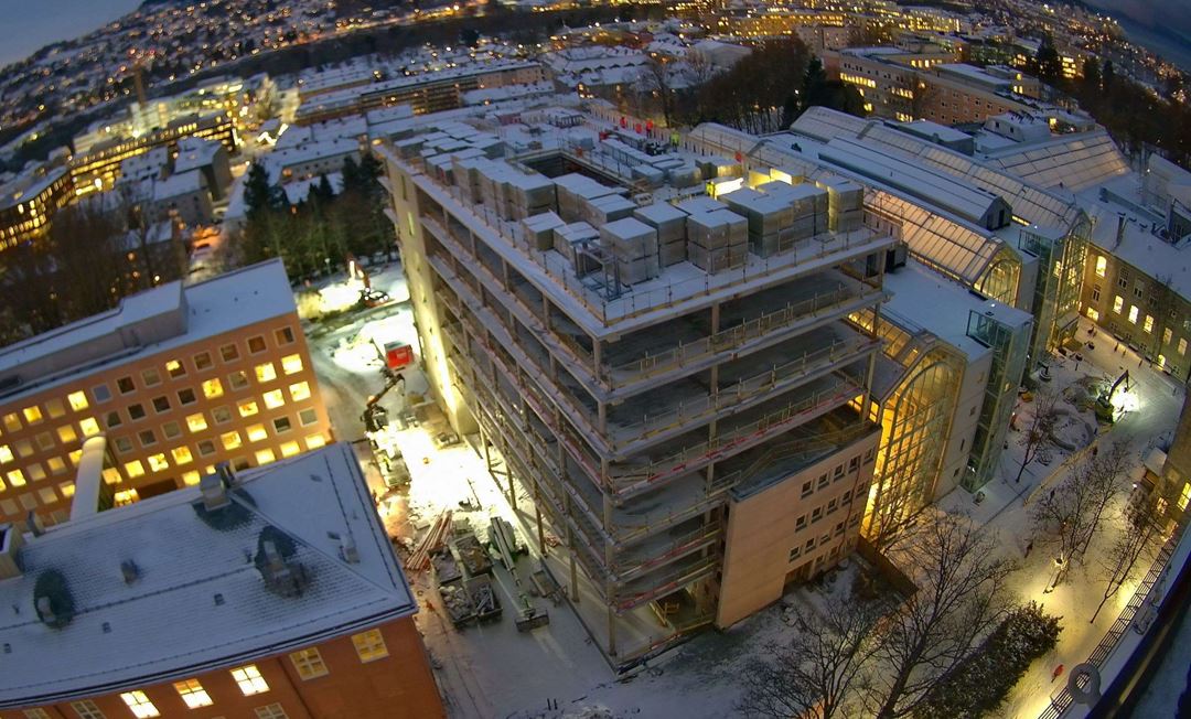 Det har vært god fremdrift på byggeplass høsten 2023, og taket er nå på plass over åttende etasje.