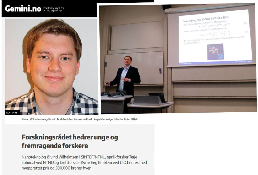 Forskningsrådets pris for unge fremragende forskere 2018 gikk til Øivind Wilhelmsen fra SINTEF Energi. Øivind Wilhelmsen er forsker ved SINTEF og professor II på NTNU. Han fikk prisen for unge fremragende forskere innenfor matematikk, naturvitenskap og teknologi for sitt fremragende bidrag til forskningen i termodynamikk og hydrogenteknologi.