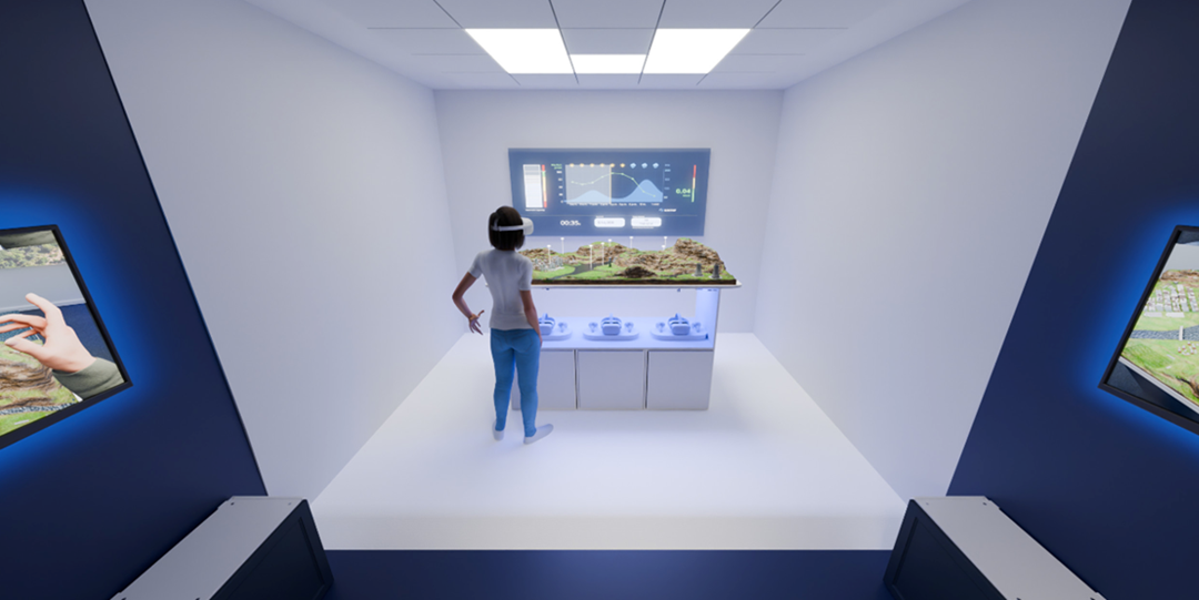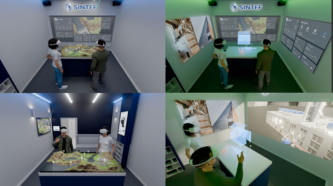 I løpet av de siste par årene har vi utviklet og bygget et showroom i SINTEF Energis nye bygg på Gløshaugen som er fullspekket med teknisk utstyr. Her finner man lyd, lys, skjermer, sensorer og ikke minst headset som åpner opp døra til den virtuelle verden. Alt er integrert og snakker sammen slik at vi kan skape demonstrasjoner på tvers av flere teknologier.
