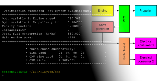 Modeller for de forskjellige komponentene blir lagt inn i FhSim, SINTEF Fiskeri og havbruks egenutviklede simulerings-rammeverk. Her kan komponentene kombineres på vilkårlig vis, noe som vil gjøre oss i stand til å modellere meget komplekse systemer. Modellen kan kobles til en optimaliseringsalgoritme som søker å finne den "beste" driftstilstanden for systemet.