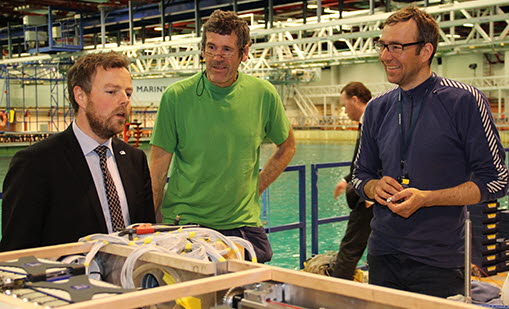 Røe Isaksen var svært engasjert under besøket på MARINTEK og snakket ivrig med studenter og ansatte både på havbassenget og MC-labben. Studenten Jostein Follestad viste fram en ny type ROV (undervannsfartøy), en ide som kan bli kommersialisert om kort tid.