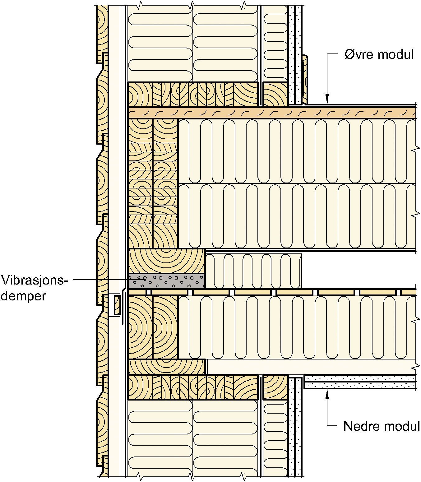 Når prefabrikkerte moduler plasseres over hverandre, får etasjeskillerne mellom boligene en relativt stor konstruksjonshøyde, noe som i utgangspunktet er gunstig for lydisolasjonen. Men med lav vekt settes konstruksjonene lett i svingninger, og det er derfor helt avgjørende å hindre lydoverføring via modulenes opplegg. Det kan oppnås ved å bruke vibrasjonsdempende mellomlegg, som illustrert på figuren, samtidig som innvendige kledninger må ha mest mulig tyngde og minst mulig stivhet for å redusere lydoverføring inn til rommene. Modulene understøttes enten langs bærende oppleggsvegger eller i opplagerpunkter ved hjørnene. I begge tilfellene må vibrasjonsdemperne være dimensjonert for tyngden av de enkelte moduler og byggets størrelse.