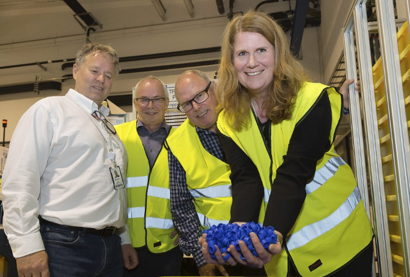 Plast brukes mer og mer, også i biler. Halvparten av bildelene fra Kongsberg Automotive (KA) lages nå av komposittmaterialer. KA er en av de plastbedriftene som er med i nettverksklyngen. Fra venstre: Geir Liaklev (KA), Jon Sandvik (SRM), Iver Jensen (NTNU) og Silje Helene Aschehoug (SRM). Foto: Henning Gulbrandsen