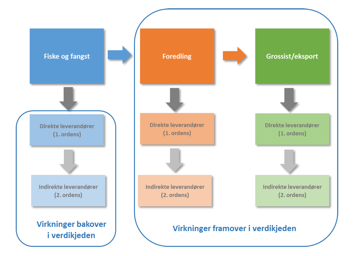 Virkninger bakover i verdikjeden betyr at fangstleddet etterspør varer og tjenester som leveres fra det øvrige næringslivet (underleverandører) mens virkninger framover i verdikjeden er det fangstleddet leverer av varer og tjenester som andre næringer og virksomheter kan utnytte, som f.eks. at råstoff videreforedles i fiskeforedlingsindustrien.