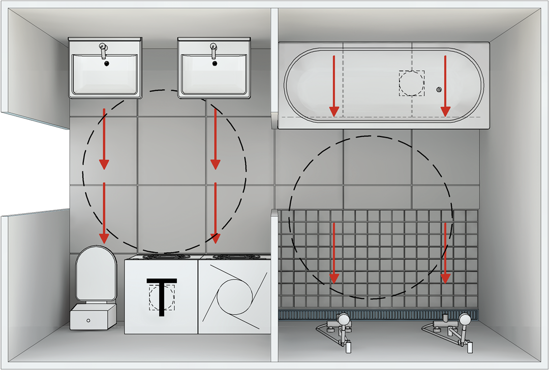 TEK17 krever fall på̊ minimum 1:50 til sluk i et område på minst 0,8 meter ut fra sluket dersom dusjen er rett over sluket. Om dusjen ikke er rett over sluket, må det i tillegg være fall på minimum 1:50 fra og med dusjens nedslagsfelt og til sluket.