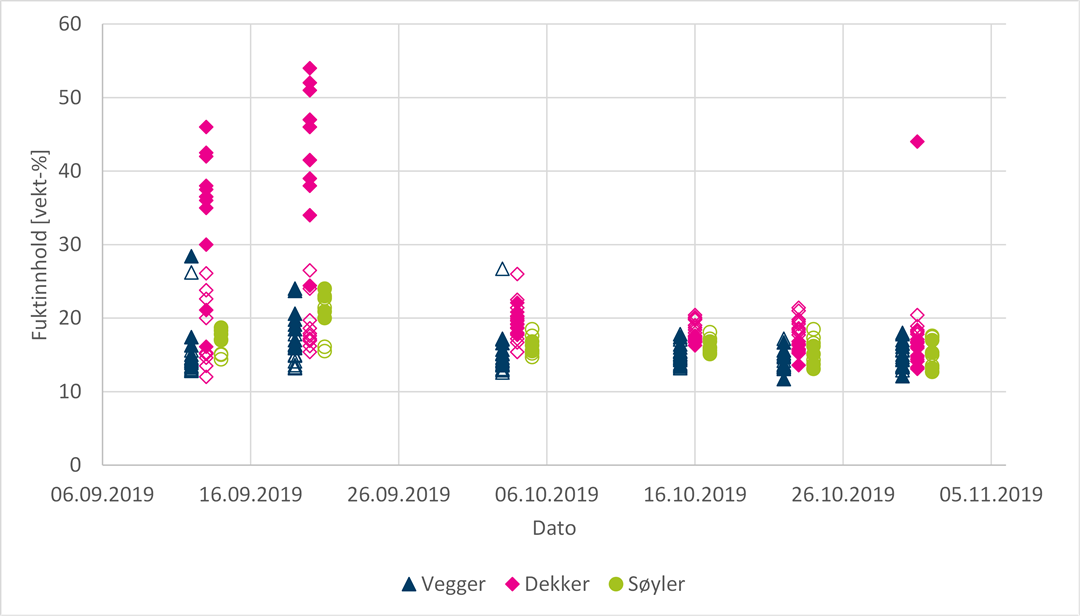Masterstudent Aleksander Bredesen ved NTNU gjorde fuktmålinger gjennom byggeprosessen. Det ble gjennomført målinger i limtresøylene, massivtredekkene og massivtreskivene. I alt hadde vi 50 målepunkt fordelt over alle fire etasjer, med måledybder mellom 0 og 30 mm.
