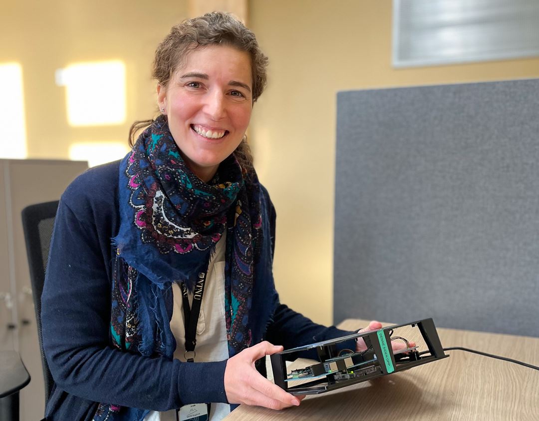 Hun viser frem en sensorboks som hun har bygd.
