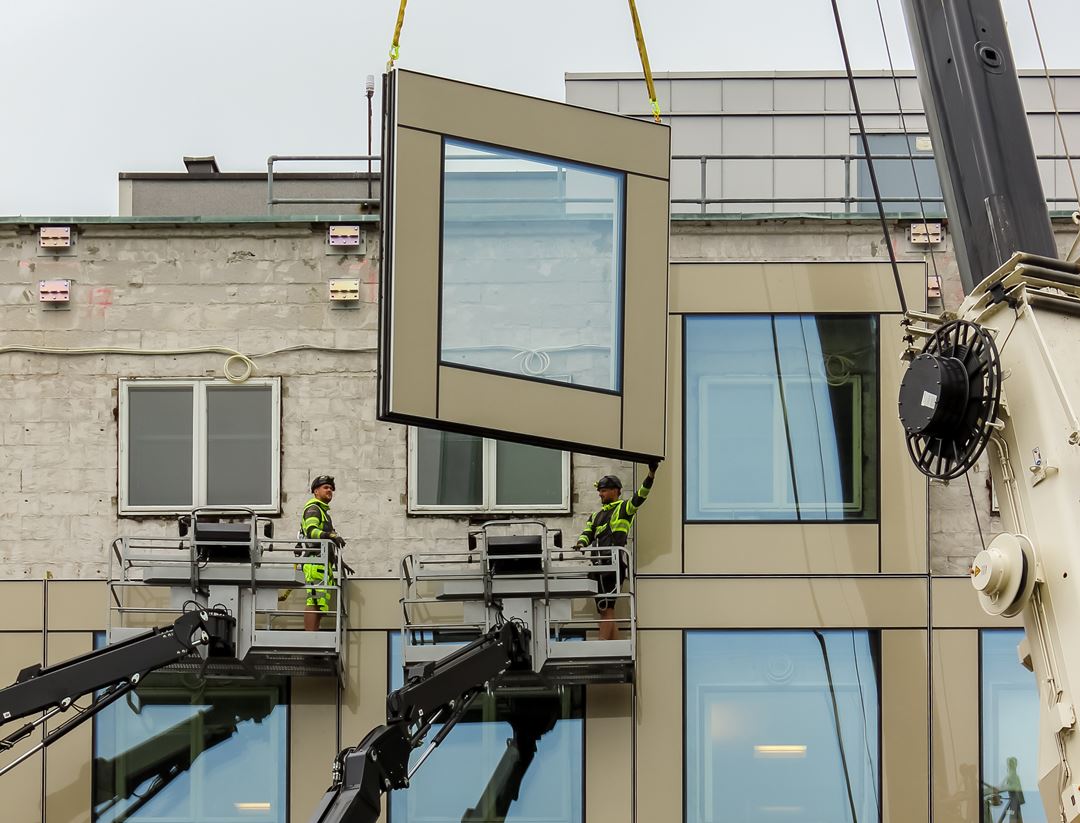 Påhengsveggene monteres på utsiden av bygningens bæresystem som en kontinuerlig «gardin» over flere etasjer.
