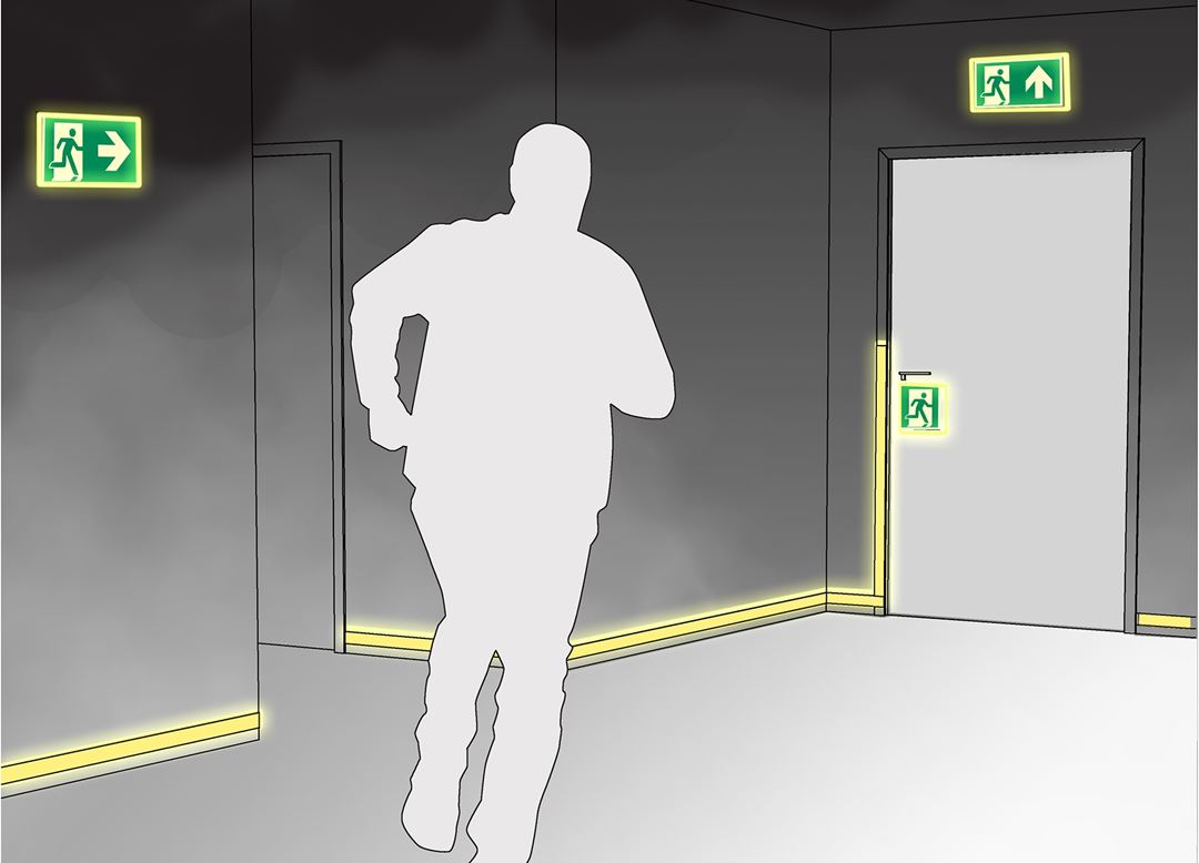 Den reviderte anvisningen 321.038 Ledesystemer for rømning ved brann beskriver plassering av ledesystem som består av markeringsskilter og ledelinjer.