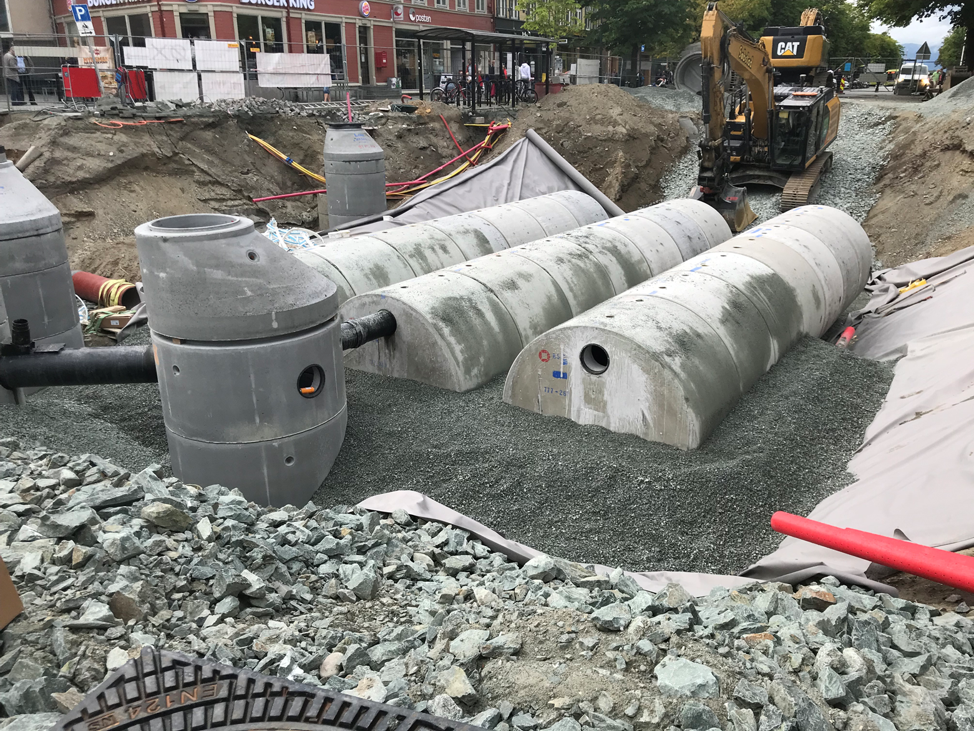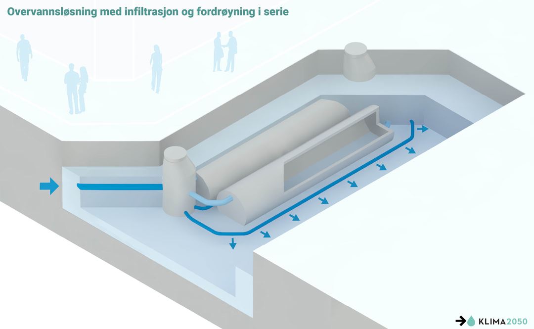 Det ble derfor utviklet en ny hybrid løsning som kombinerer infiltrasjon og fordrøyning på torvet. Løsningen ble utviklet av Trondheim kommune sammen med Multiconsult i forskningssenteret Klima 2050.
