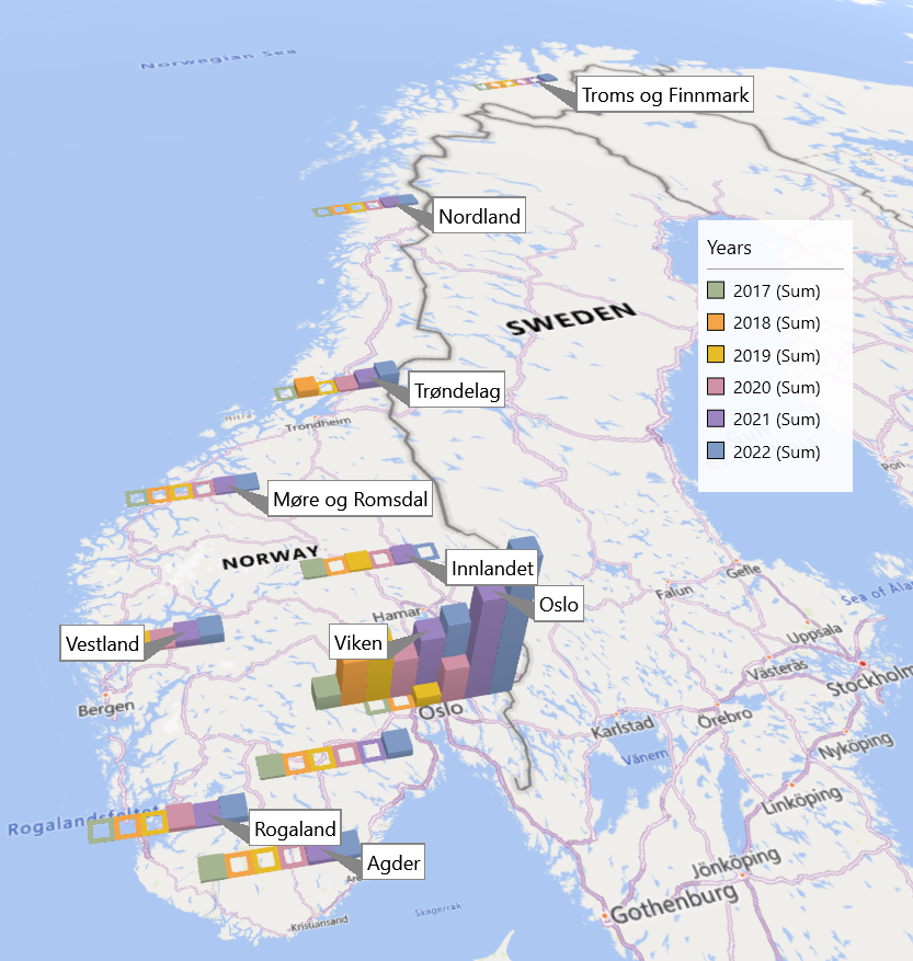Kartleggingen omfatter totalt 283 offentlige prosjekter i Norge som har brukt elektriske anleggsmaskiner i perioden 2017 til 2022. Viken og Oslo har, med 42 prosent hver, høyest andel prosjekter med elektriske anleggsmaskiner.