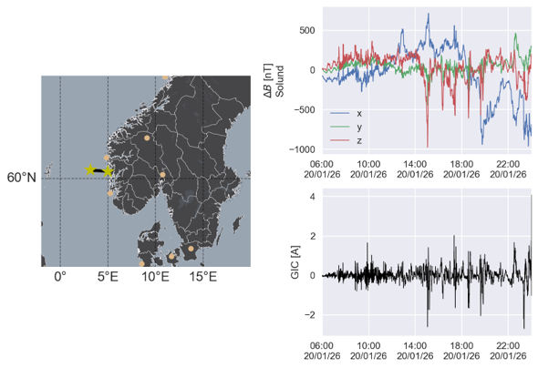 Solstormer kan måles i sjøkabler. Figuren viser påvirkning på sjøkabler til offshore vindturbiner og oljeplattformer.
