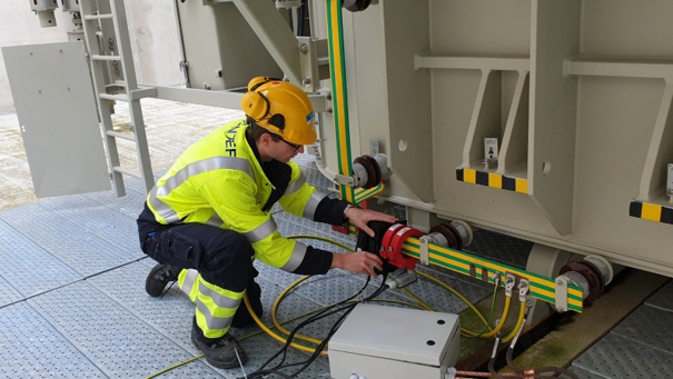 Montasje av solstormmålere på en norsk transformator. Disse måler likestrøm i nøytralpunktet til transformatorene. I et ideelt system skal denne strømmen være like null, men forstyrrelser i jordas magnetfelt forårsaket av solstormer skaper likevel sterke likestrømmer som kan skade transformatorene. Foto: SINTEF