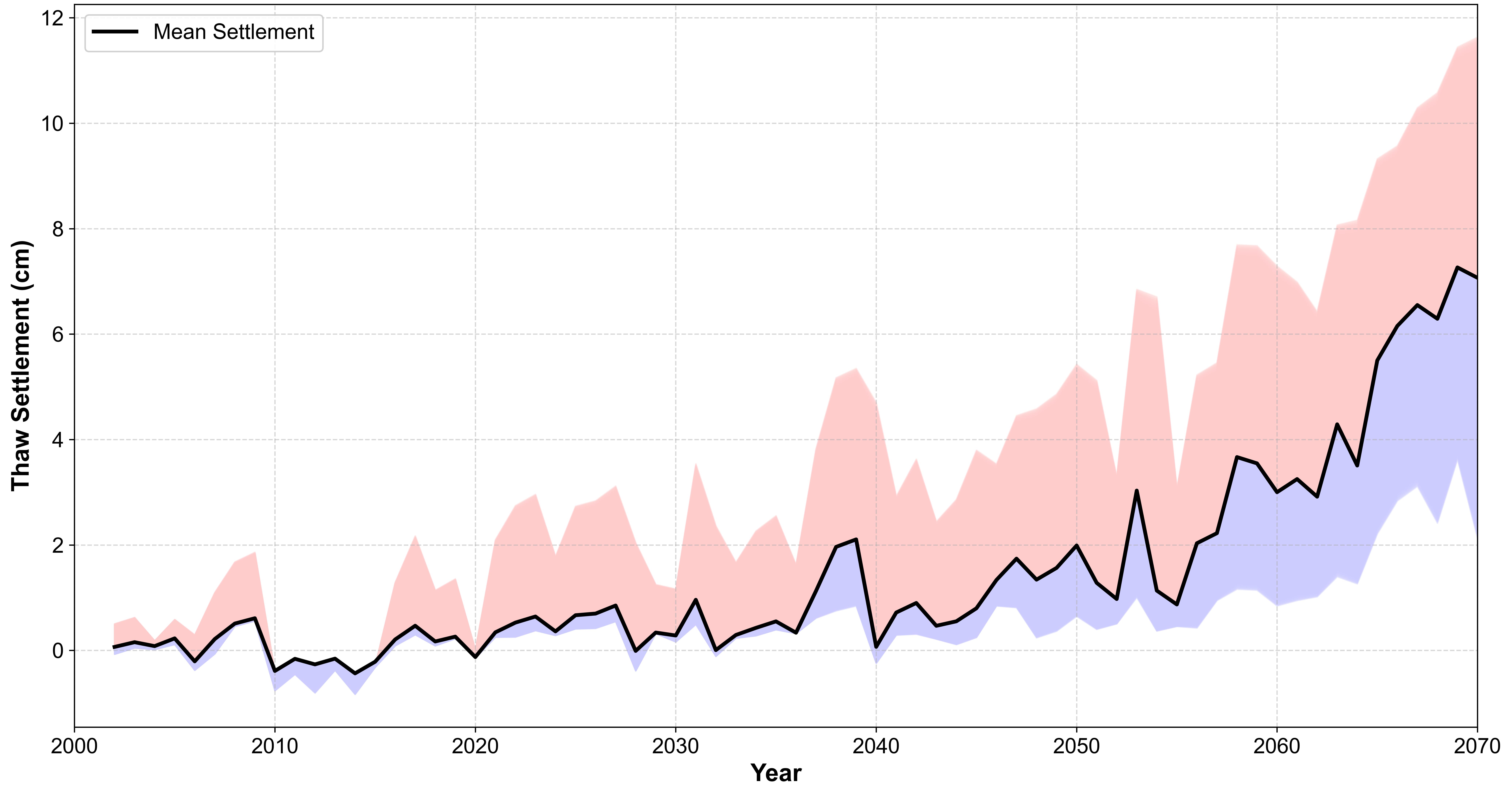 Derfor var det ikke mulig å hente ut frosne kjerneprøver. Dette tyder på relativt lavt isinnhold, og antyder at framtidig tining neppe vil føre til omfattende setninger på disse stedene.