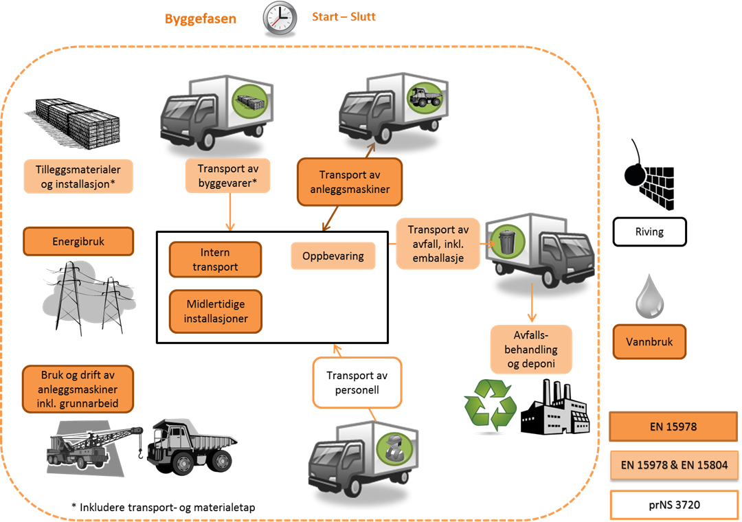 Forskningssenteret for nullutslippsbygg (ZEB) har funnet ut at utslipp i driftsfasen av et undervisningsbygg tilsvarer de totale utslippene i byggefasen. Utslippene fra byggeaktiviteter skjer i løpet av en kort periode, mens utslipp i driftsfasen fordeles over 60 år, eller mer. Dette viser at det i byggefasen er et stort potensial for å redusere de samlede negative miljøeffektene over bygningens levetid.