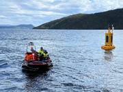 Her er den nye observasjonsbøyen kommet på plass, den andre av to som kontinuerlig henter havmiljødata fra Trondheimsfjorden. Foto: Emlyn John Davies/SINTEF Kortnytt Den nye bøyen...