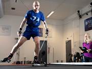 Professor og langrennsløper Øyvind Sandbakk ved NTNU er utstyrt med sensorer mens han tester ulike delteknikker for langrenn på tredemølla. Forsker Trine Seeberg i SINTEF samler...