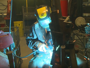 Metallurgi er en av disiplinene som er representert i det tverrfaglige industristøv-prosjektet. Her løfter to SINTEF-medarbeidere en glovarm smeltedigel ut av en laboratorieovn. Støv...