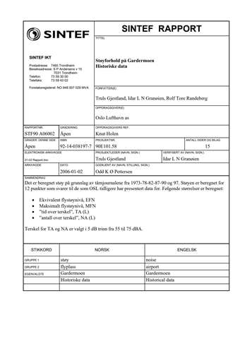 STF90 A06002 Det er beregnet støy på grunnlag av tårnjournalene fra 1973-78-82-87-90 og 97. Støyen er beregnet for 12 punkter som svarer til de som OSL tidligere har presentert data for. Følgende størrelser er beregnet: • Ekvivalent flystøynivå, EFN • Maksimalt flystøynivå, MFN • ”tid over...