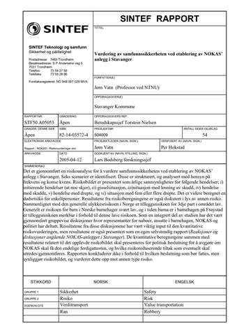 Det er gjennomført en risikoanalyse for å vurdere samfunnssikkerheten ved etablering av NOKAS’ anlegg i Stavanger. Seks scenarier er identifisert. Disse er strukturert og analysert med hensyn på frekvens og konsekvens. Risikobildet er presentert som årlige sannsynligheter for følgende hendelser; i...
